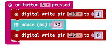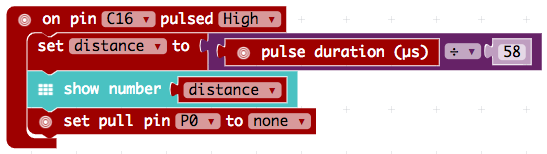 Ahora hay que esperar en el pin 16 una señal de entrada digital. Esto se hace con el bloque "on pin x pulsed y". Tan pronto como el ultrasonido recibe el eco, el sensor de ultrasonido conecta la corriente en el cable que llega al pin 16 muy brevemente. Cuanto más lejos esté el objeto, más tiempo permanecerá encendida la corriente. La duración es de unos pocos microsegundos (µs) a unos pocos milisegundos (ms). Esto es demasiado rápido para nosotros los humanos. El Calliope mini puede medirlo fácilmente, sin embargo, y la duración de la señal indica la distancia.