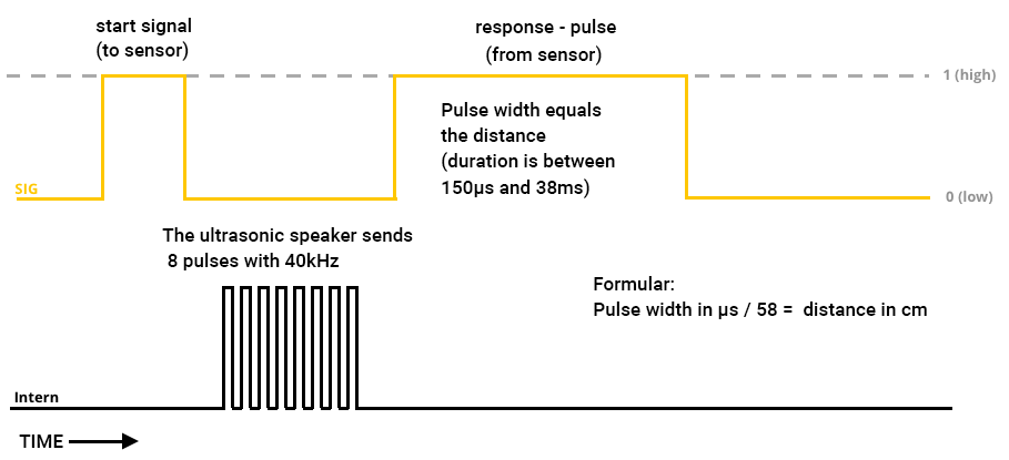 Enchufe el sensor de ultrasonido en el conector derecho de Grove y, a continuación, encienda (1) y apague (0) una vez que haya conectado brevemente la clavija 16 (cable amarillo, SIG). Esto se denomina señal digital (1 o alta = activada, 0 o baja = desactivada). Esta es la señal para que el sensor emita un sonido de ultrasonido y espere el eco que llega cuando el sonido golpea un objeto y regresa de nuevo. Hacemos esto cuando se presiona el botón A.