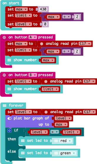 En el bucle forever, el calliope mini es instruido para mostrar un LED verde si el nivel actual está por debajo del límite, de lo contrario, ROJO. Usted podría fácilmente extender el programa para enviar un mensaje de radio para notificar a otro calliope mini de tiempo lluvioso o un aumento del nivel del agua (alarma para el cuarto de lavadora?).