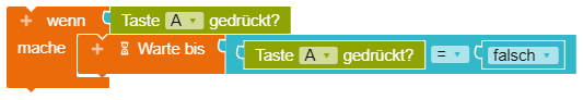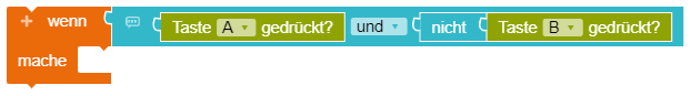 Wenn Taste A und B gleichzeitig gedrückt wird, soll verhindert werden, dass das Drücken von Taste A oder B zusätzlich wahr ist. Es muss also ausgeschlossen werden, dass auch die anderen Tasten nicht gedrückt werden, um die Events klar voneinander abzugrenzen. Das kann durch die Bedingung "wenn Taste A gedrückt und nicht Taste B gedrückt" realisiert werden.