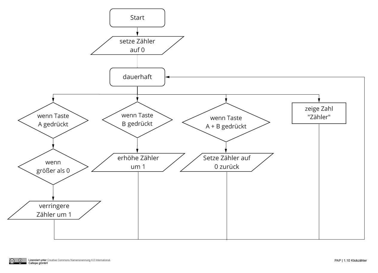 - Wenn Taste B gedrückt wird, erhöht sich die Variable "Zähler" um 1