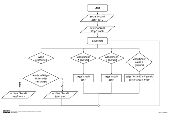 Mit dem Schütteln des Calliope mini wird der Zufallsgenerator aktiviert. Dieser soll Kopf oder Zahl produzieren.