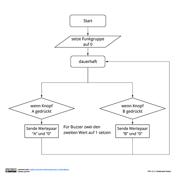 Wird für die Antwort A Knopf A gedrückt, wird der Buchstabe A und die Kandidat:innennummer 0 an den Quizmaster gesendet.