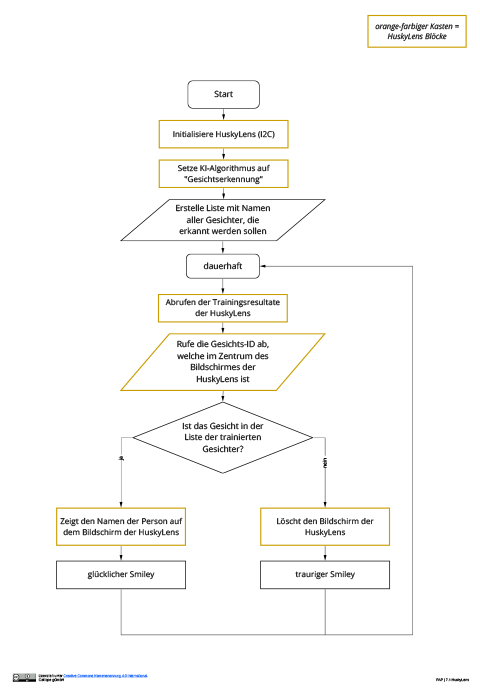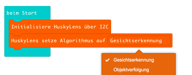 Um zu starten, muss die HuskyLens erst im Startblock initialisiert und der jeweilige Algorithmus ausgewählt werden - in diesem Fall "Gesichtserkennung".