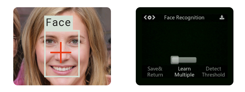 Damit die KI sich ein Gesicht merkt, kann der rechte "Lern-Knopf" (2) kurz gedrückt werden, um dem Gesicht eine ID zuzuordnen. Anschließend sollte das Gesicht der gleichen Person als gleiches Gesicht wiedererkannt werden.