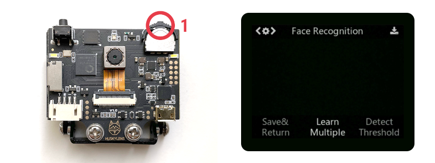 Drücke dazu auf das Rädchen (1) an der HuskyLens und drehe es zur Seite, bis der Algorithmus Gesichtserkennung auftaucht. Drücke das Rädchen (1) erneut, um die Gesichtserkennung auszuwählen.