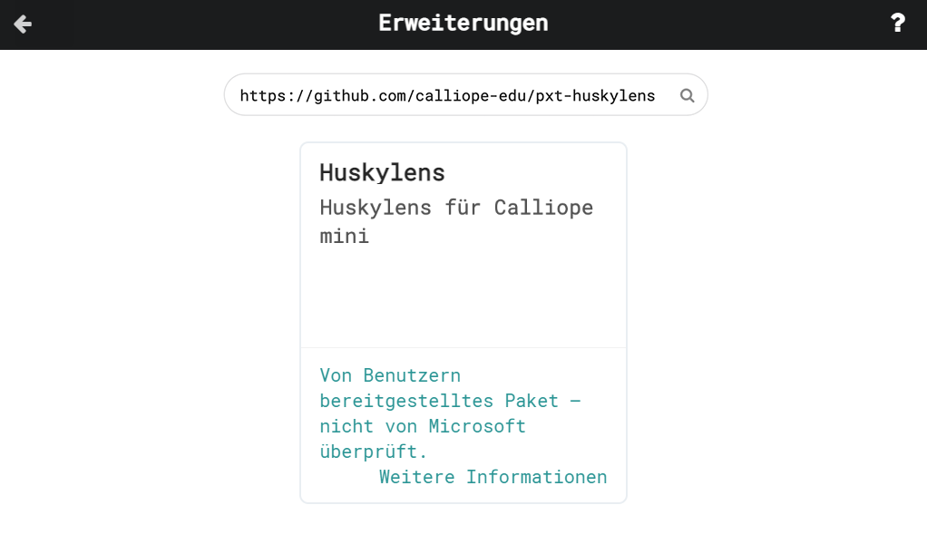 Als erstes muss die HuskyLens Bibliothek importiert werden. Dazu muss in MakeCode auf die fortgeschrittenen Blöcke Erweiterungen geklickt und der folgende Link in die Suchzeile eingegeben werden: https://github.com/calliope-edu/pxt-huskylens