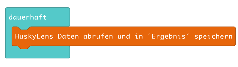 Um die Daten der HuskyLens für die trainierten Gesichter(IDs) dauerhaft abzurufen, wird der Block "HuskyLens Daten abrufen und in ‘Ergebnis’ speichern" verwendet.