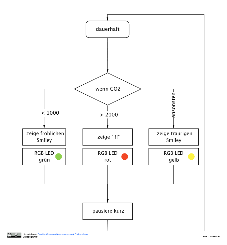 Der Calliope mini wird zur CO2-Ampel, welche über die LED-Matrix und die RGB-LED anzeigt, wie hoch die CO2-Konzentration ist.