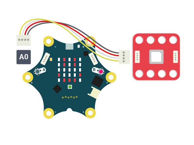 1. Mit dem Grove-Kabel wird der SCD40 über den Grove-Anschluss A0 mit dem Calliope mini verbunden.