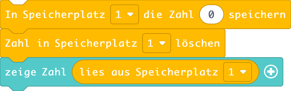 Die Blöcke der Kategorie Speicher ermöglichen es, Daten in einem Zwischenspeicher des Calliope mini zu speichern. Die Daten bleiben auch bei einem Neustart des Calliope mini bzw. einer Trennung vom Strom erhalten und können jederzeit abgerufen werden.