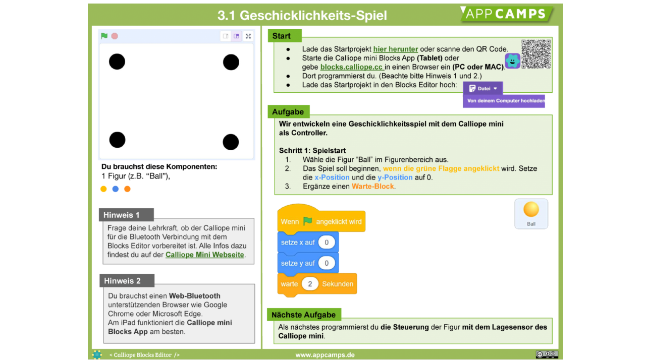 Mit dem Lagesensor des Calliope mini wird eine Kugel auf dem Screen gesteuert. Werden die vier Ecken erreicht, gibt es einen Punkt.