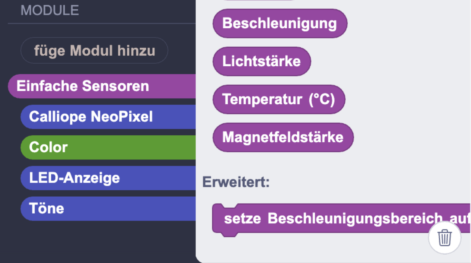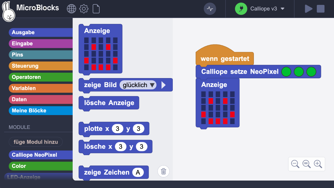 MicroBlocks verfügt über eine Vielzahl an Blöcken für grundlegende Programmierkonzepte. Erweiterungen, Sensoren sowie bestimmte Hardwarekomponenten, wie beispielsweise RGB-LEDs (Neopixel) oder die LED-Matrix, können als Module hinzugefügt werden. Nach dem Verbinden des Calliope mini erscheinen unter dem Reiter „Module“ automatisch die jeweils verfügbaren Blöcke.