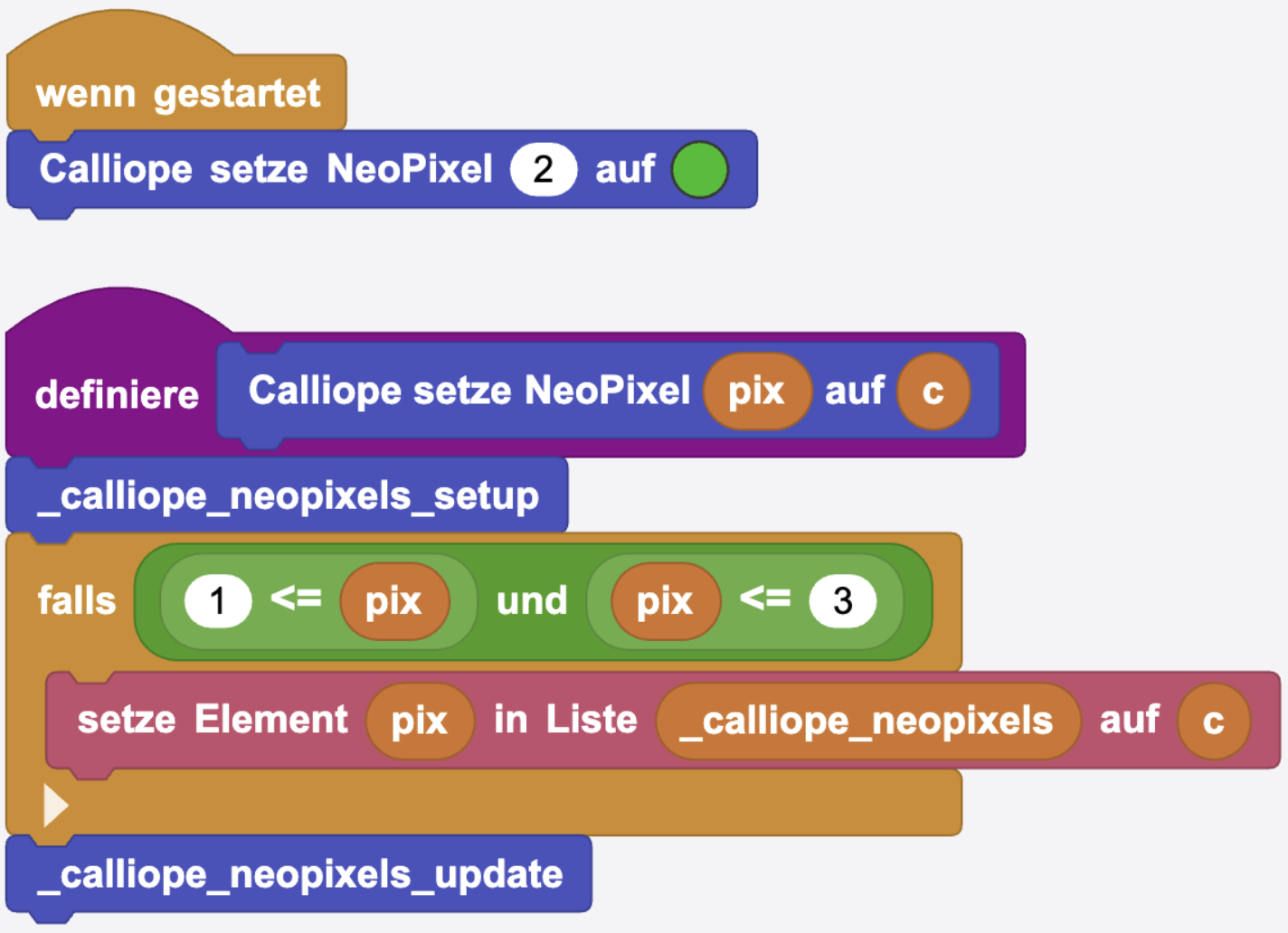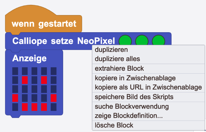 Bestimmte Blöcke, die nicht zu den Grundlagen gehören, können per Rechtsklick in ihrer vollständigen Blockdefinition angezeigt und angepasst werden. Die Blockdefinition entspricht einer Funktion. Unter „meine Blöcke“ lassen sich eigene Funktionen und Blöcke definieren.