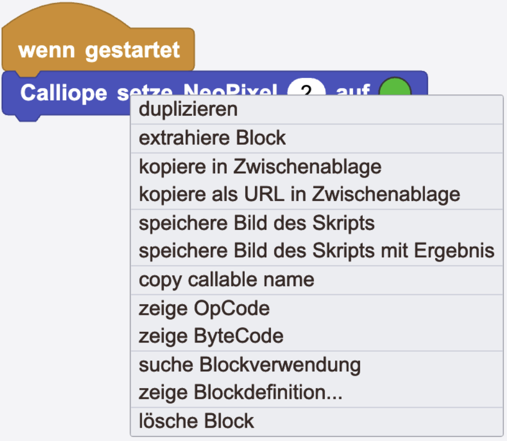 Beim Rechtsklick auf einen Block stehen zusätzliche Funktionen zur Verfügung, die bei der Entwicklung oder Dokumentation des Programms unterstützen.
