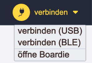 Im nächsten Schritt kann der Calliope mini entweder über USB (WebUSB) oder über Bluetooth (BLE) verbunden werden. Die Verbindung über Bluetooth ist beispielsweise dann sinnvoll, wenn der Calliope mini nicht direkt mit einem USB-Kabel verbunden ist.