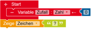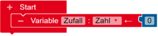 Als erstes erstellst du eine Variable. Dazu klickst du auf das + Symbol im Start Block. Dann benennst du die Variable mit Zufall.