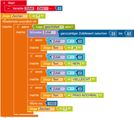 Um wieder ein Fragezeichen nach der Antwort anzeigen zu lassen fügst du am Ende noch einen Zeige Text Block ein. Nun musst du nur noch Text zu Zeichen ändern und das Fragezeichen im Textfeld eintragen.