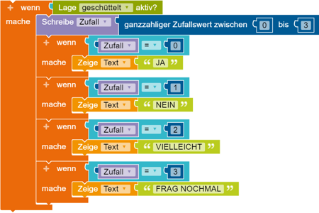 Jetzt wählst du unter Kontrolle den wenn - mache Block aus, um die Bedingung festzulegen. Dann fügst daran den Lage aufrecht aktiv Block? aus dem Sensoren-Menü an, um den Lagesensor anzusteuern. In der Auswahl änderst du nun aufrecht zu geschüttelt.