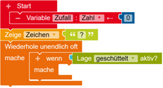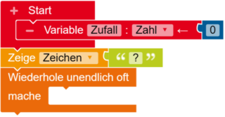 Damit beim Start des minis ein Fragezeichen angezeigt wird, nimmst du den Zeige Text Block, den du unter Aktion findest, änderst Text zu Zeichen und trägst ein Fragezeichen ein.