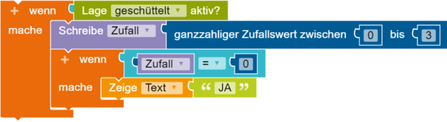 Jetzt fügst du einen weiteren wenn - mache Block ein und hängst an diesen den Block = aus dem Logik-Menü. Nun füllst du den Block mit der Zufall Variable, aus dem Variablen-Menü und einer 0, um die Bedingung für den Wert null der Variable festzulegen. Danach nimmst du einen Zeige Text Block und trägst deine Antwort in das Textfeld ein.