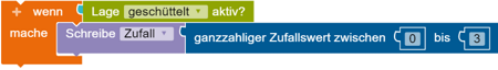 Als nächstes suchst du den Schreibe Zufall Block aus dem Menü Variablen raus. An diesen fügst du den ganzzahliger Zufallswert zwischen 1 bis 100 Block, aus dem Mathematik-Menü an, änderst die 1 zu einer 0 und die 100 zu einer 3.