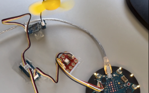 Die CO2- Ampel mit einem Propeller zur Aufbesserung der Luftqualität und einem verbundenen Display, welches anzeigt, ob der CO2-Gehalt gut ist oder das Fenster geöffnet werden muss. Außerdem wird das genaue Gehalt auf dem LED-Display des Calliope minis angezeigt.