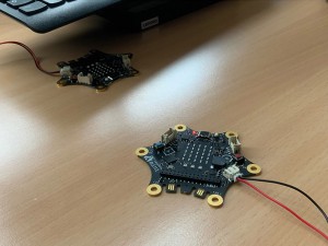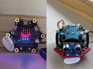 Einen portablen Calliope mini, der als Lichtsensor dient, und einen stationären Calliope mini, der ein Signal vom portablen Sensor empfängt und ein aufleuchtendes Zeichen/Text abgibt