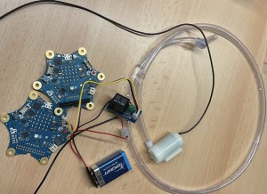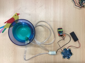 Wir haben uns für eine automatisierte Vogeltränke mit integrierter Kamera zur Vogelerkennung entschieden. Die automatisierte Vogeltränke funktioniert mit einem Feuchtigkeitssenor. Bei Trockenheit sendet dieser über den Calliope mini per Funk eine Zahl an den anderen Calliope mini. Dieser aktiviert eine Pumpe, wodurch die Vogeltränke befüllt wird. Außerdem ist eine KI-Kamera installiert. Mit dieser werden Vögel erkannt und gezählt.