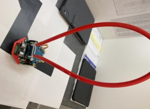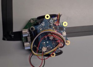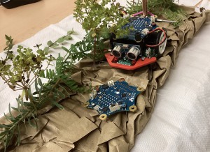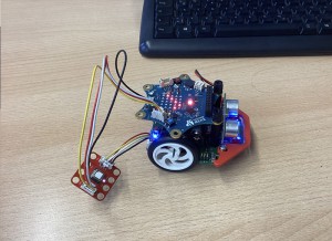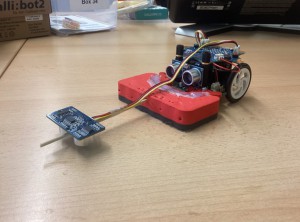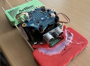 Wir haben uns für einen Calliope mini entschieden, welcher einen Schwamm an sich befestigt hat, der selbstständig Oberflächen reinigen kann, indem er durch den Ultraschallsensor die Tischkanten erkennen und vermeiden kann. Wenn er sie erkennt, dreht er um und fährt in eine zufällige Richtung. Der Calliope mini fährt von alleine und säubert die Oberflächen bis man ihn ausschaltet. Man muss die Oberfläche wie zum Beispiel ein Tisch nur mit etwas Wasser einsprühen.