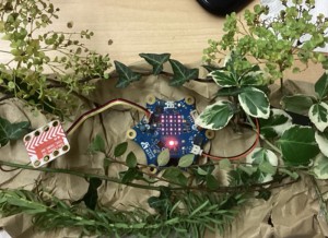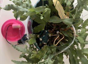 Ein Messgerät, um den Gesundheitsstatus der Pflanzen zu prüfen. Mit Knopf A werden, wenn die Lichtstärke in Ordnung ist ein Smiley und die Farbe grün gezeigt. Wenn die Lichtstärke nicht in Ordnung ist, zeigt der Calliope die Farbe rot. Mit dem Knopf B wird die Temperatur gemessen. Der Text "gießen" wird gezeigt, wenn die Temperatur zwischen 16 °C und 23 °C beträgt.