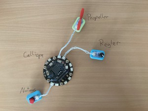 Die Idee ist, die Luft mithilfe eines Propellers zu kühlen. Der Propeller soll mithilfe eines Reglers einstellbar sein. Für die Umsetzung des Programms wird das Boson Kit für den Calliope mini V3 benötigt.