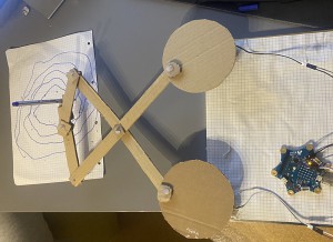 Ein selbst gebauter Arm aus Pappe ist an zwei Rädern befestigt , und sobald die über den Calliope Mini gesteuerten Räder sich drehen, fängt der Roboter an zu malen.