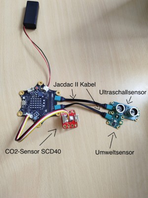 Der Calliope mini misst den CO2-Wert, die Temperatur und die Entfernung durch den CO2-Sensor SCD40, den Umweltsensor aus dem Jacdac II und dem Ultraschallsensor, der ebenfalls in dem Jacdac II enthalten ist. Dieser soll Rauchbildung, Hitze, Bewegung und Feuer erkennen. Die Warnung wird nur gegeben, wenn alle Faktoren gegeben sind.