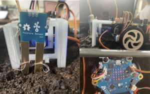 Der Calliope Mini misst mit dem Feuchtigkeitssensor die Feuchtigkeit im Boden und zeigt mit verschiedenen Farben und Mustern auf dem LED-Raster an, ob der Boden zu trocken oder zu feucht ist. Falls der Boden zu trocken ist, wird die Pumpe eingeschaltet und pumpt mithilfe eines Wasserbehälters Wasser auf die Erde. Wenn der Boden zu feucht ist, wartet der Calliope Mini bis das Wasser aufgenommen wurde.