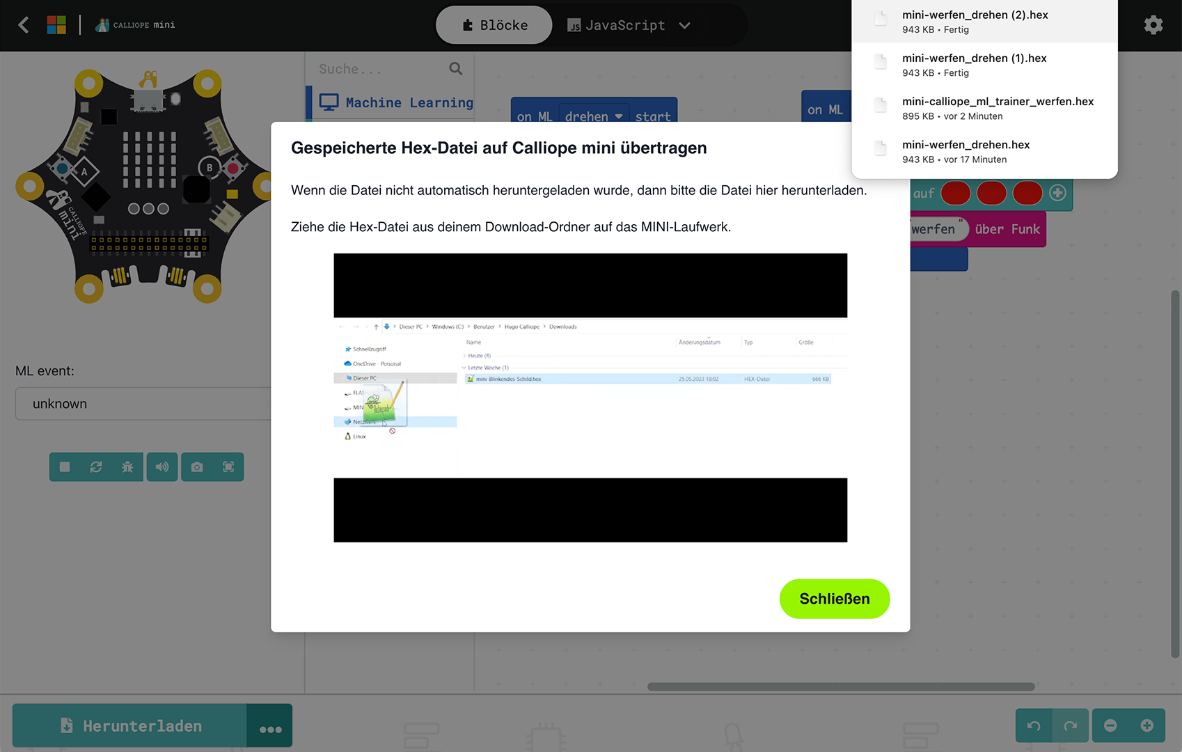 Das KI-Training Projekt kann jederzeit gespeichert werden. Die gespeicherte .Hex-Datei beinhaltet alle Datensätze, das Modell und den Programmcode. Die .Hex-Datei kann als gespeicherte Session geöffnet und fortgesetzt werden sowie auf dem Calliope mini ausgeführt werden.