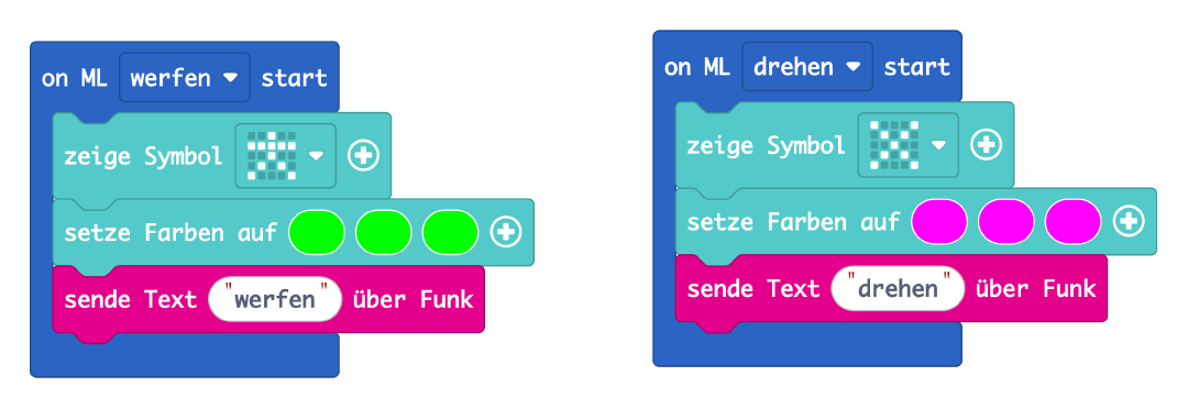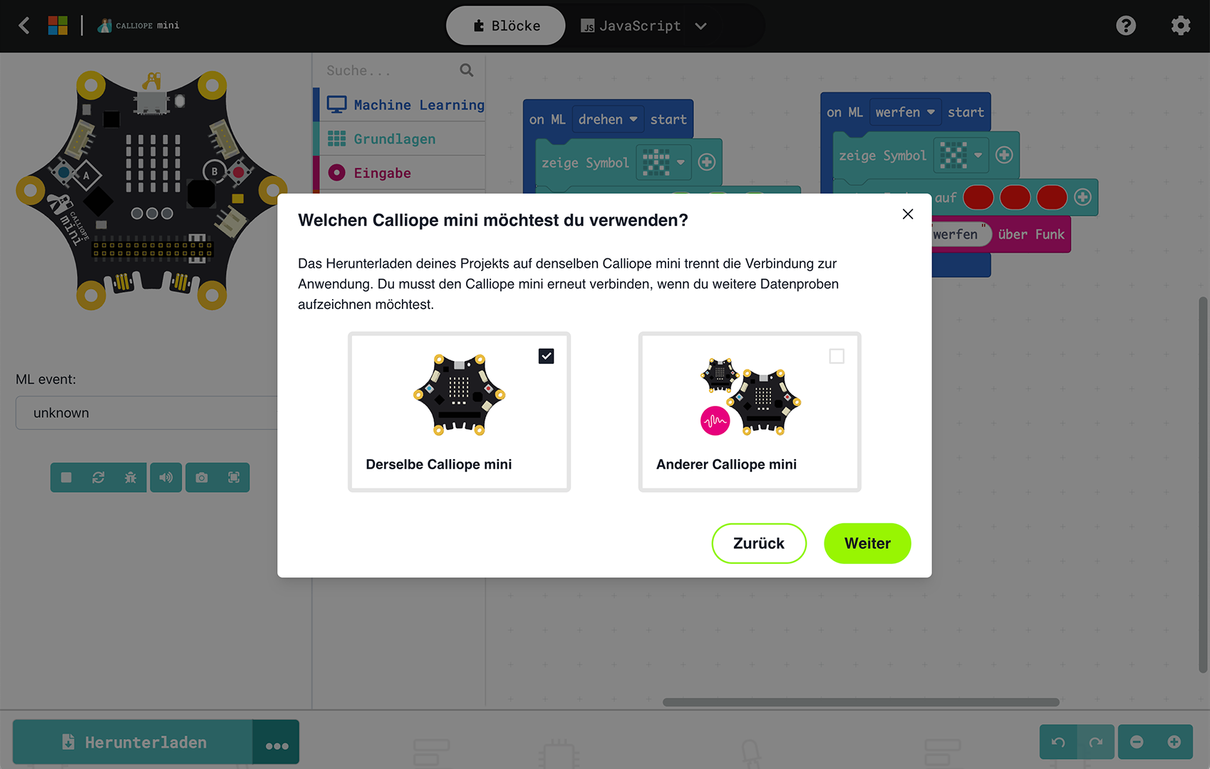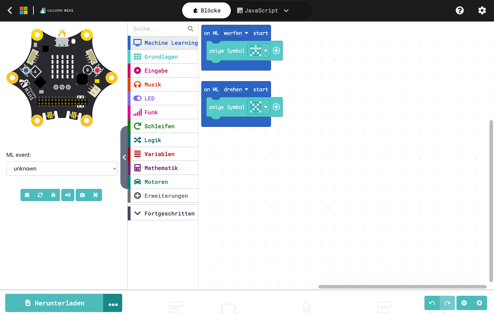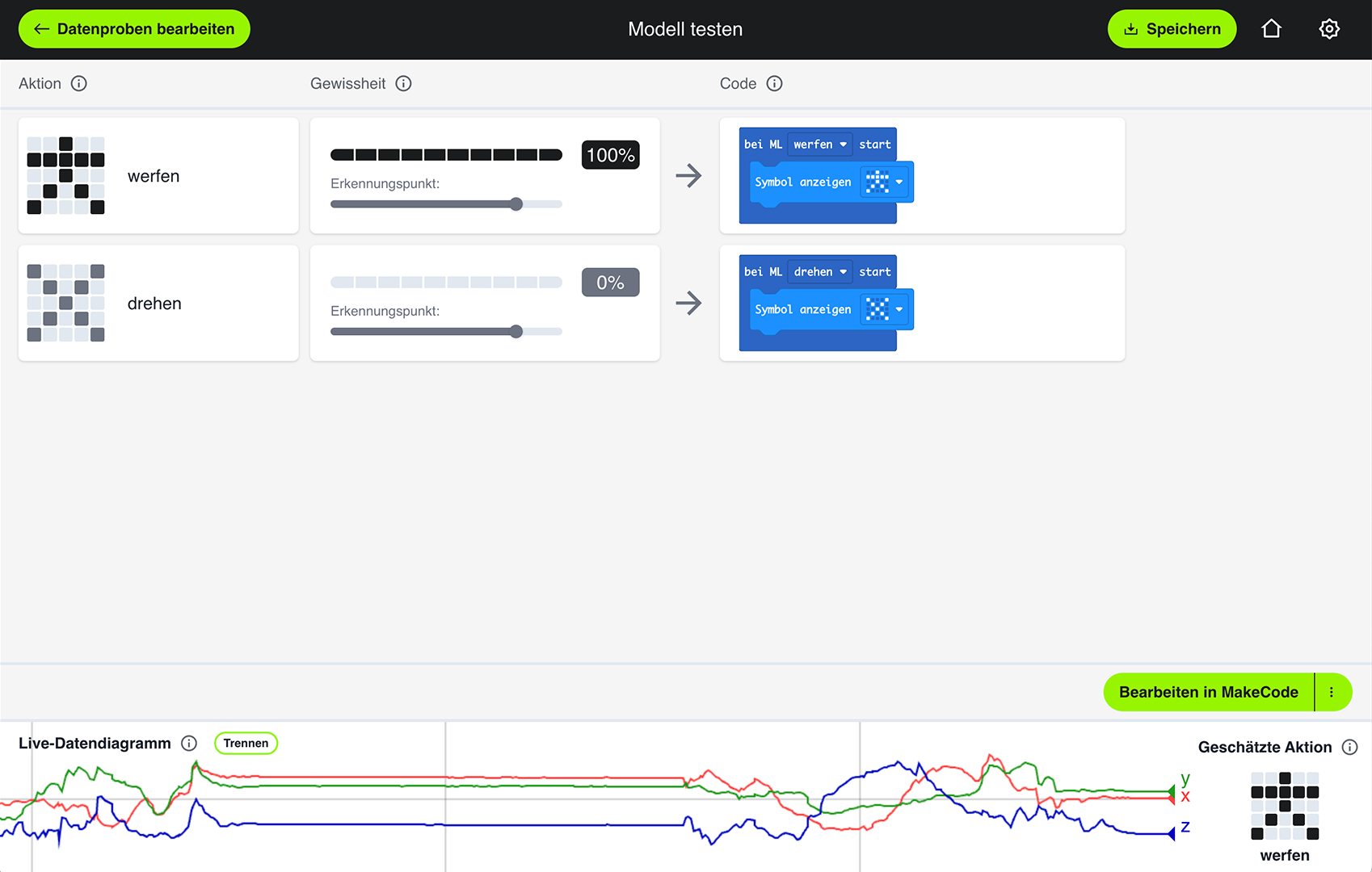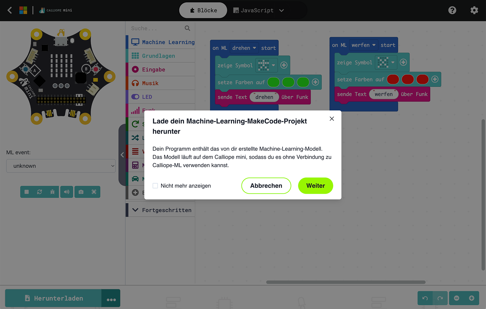 Das trainierte Modell wird in ein MakeCode-Programm integriert und auf den Calliope mini übertragen. Der Algorithmus läuft anschließend autark auf dem Gerät und steuert eine eigene Anwendung.