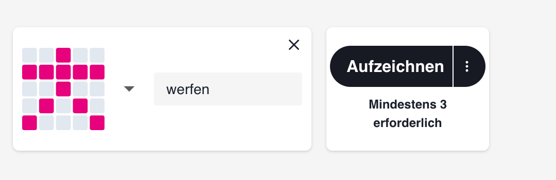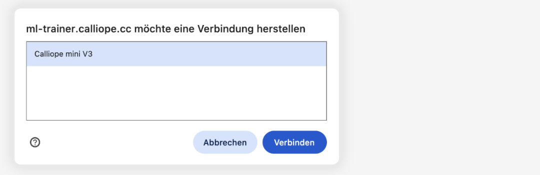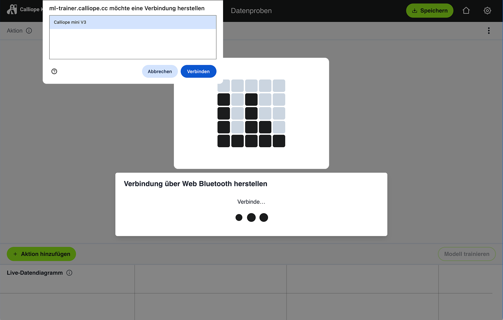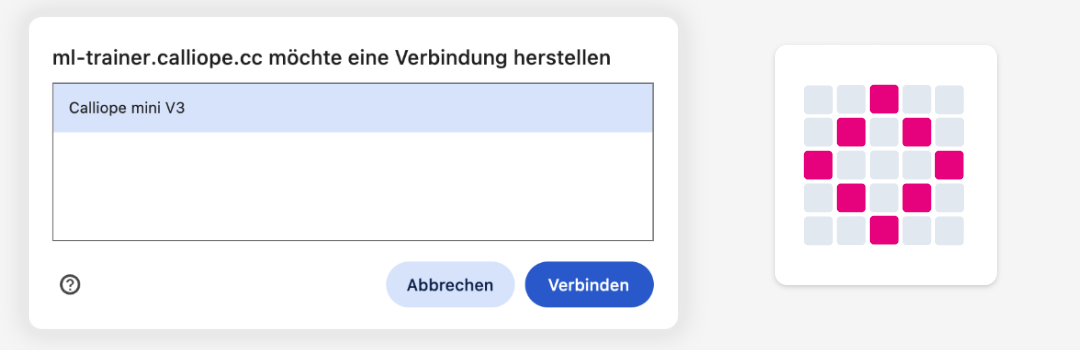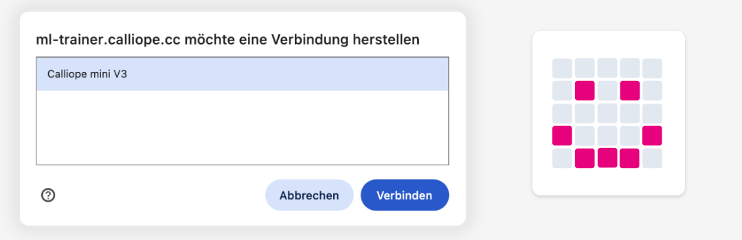 Der Calliope mini wird über Web-Bluetooth mit KI-Training verbunden. Die Verbindung wird überprüft, indem das angezeigte Muster auf der LED-Matrix mit dem im Browser dargestellten Muster abgeglichen wird.
