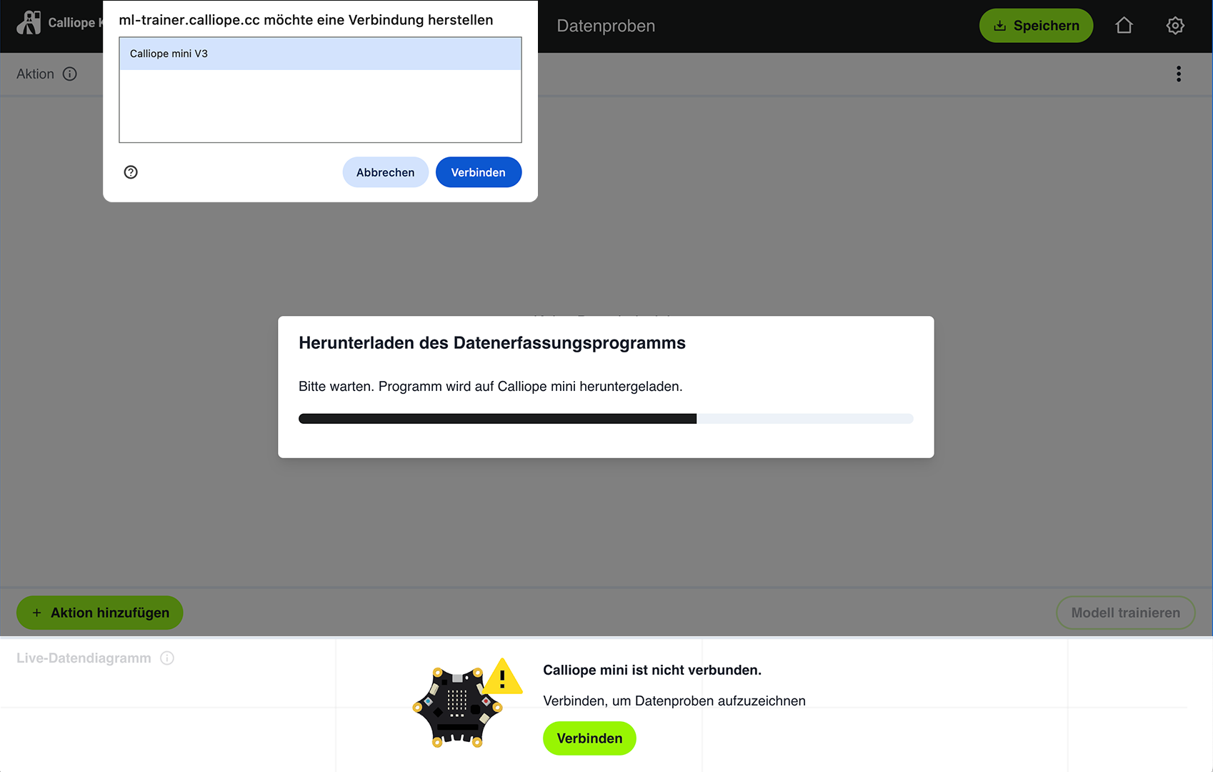 Der Calliope mini wird per Web-USB mit dem Computer verbunden. Anschließend wird das Datenerfassungsprogramm auf den Calliope mini heruntergeladen.