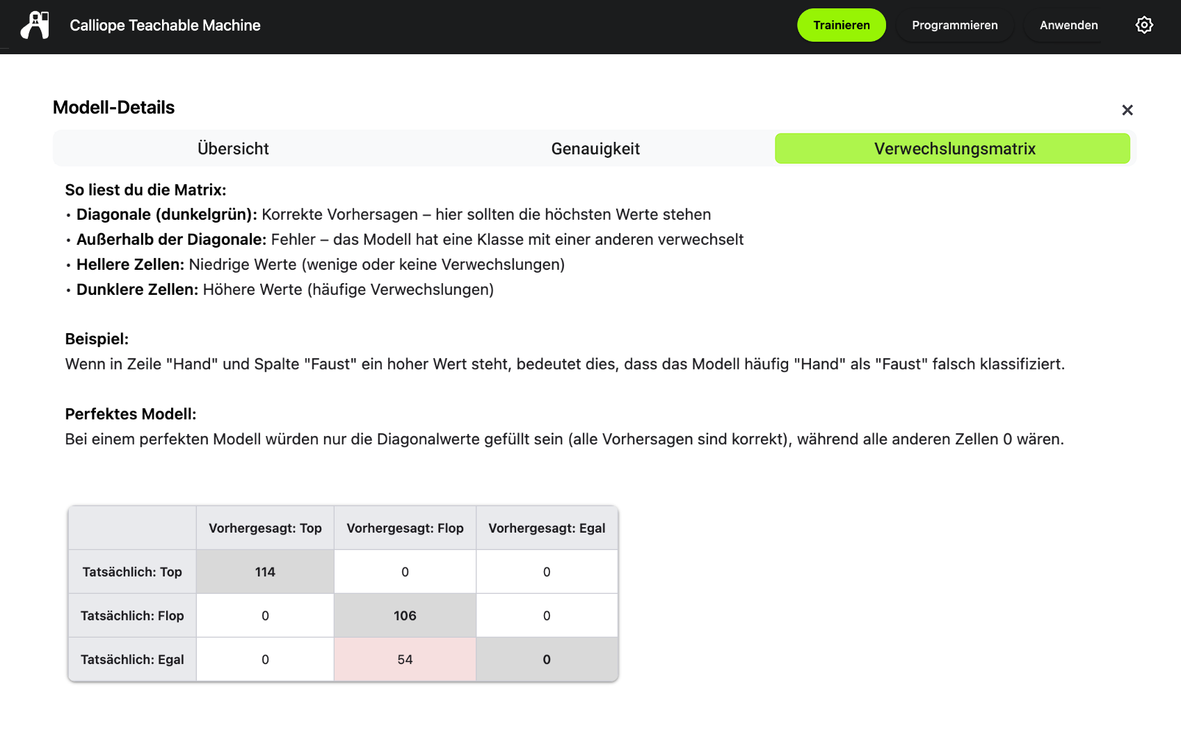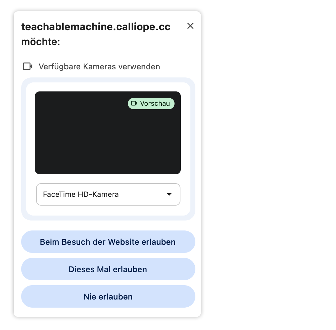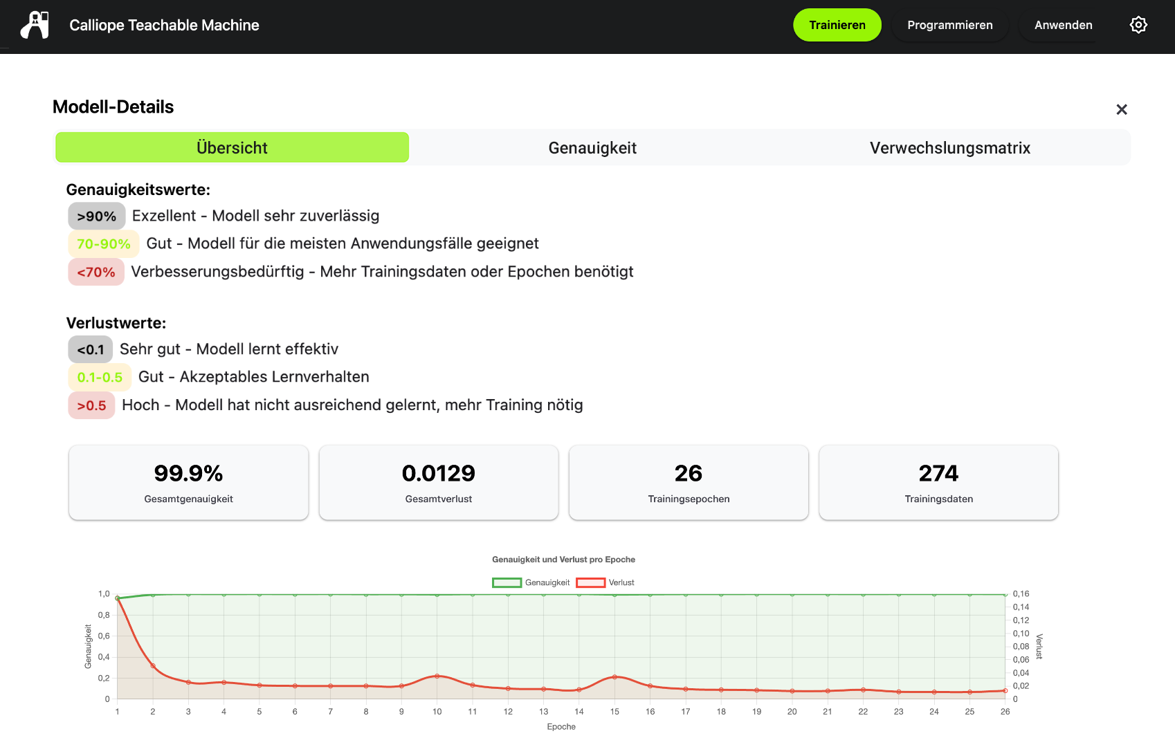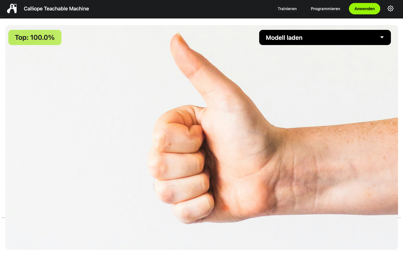 Die Calliope Teachable Machine ist eine webbasierte Anwendung, mit der auf einfache Weise ein eigenes Modell des maschinellen Lernens erstellet werden kann. Dazu werden mit der Kamera Bilder gesammelt und verschiedenen Klassen zugeordnet. Auf Basis dieser Trainingsdaten wird ein Modell erstellt, das Eingaben über die Kamera erkennen und klassifizieren kann.