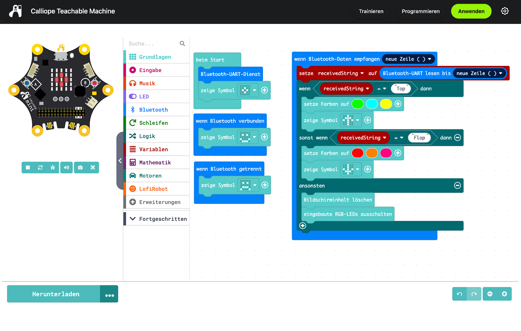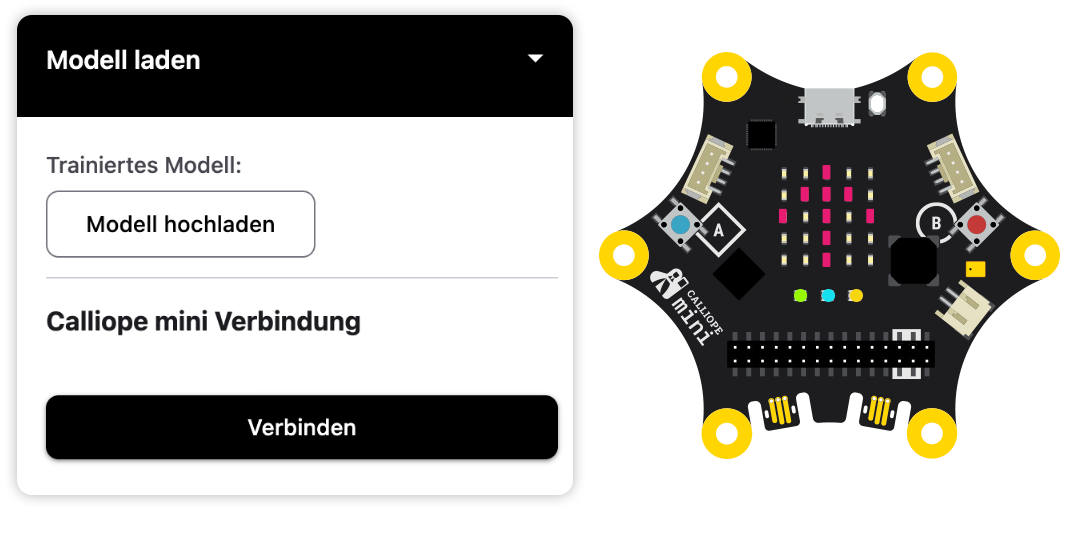 Calliope Teachable Machine bietet die Möglichkeit den Calliope mini direkt zu verbinden. Dadurch lassen sich die erstellten Modelle in einfachen Programmen nutzen, um beispielsweise interaktive Projekte oder Prototypen zu entwickeln.